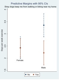Covariate-adjusted OLS regression using list-wise deletion (used due to ease of post-estimation commands) results are presented. Results are similar in models using data with missing values managed using multiple imputation (see Supplementary Materials). The interaction effect is tested for statistical significance and presented by predictive days per week of physical activity using the margins command in Stata 18.0. The statistical significance of the lower-order effect of stray dog concerns is also assessed by gender and reported.