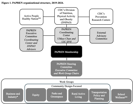 In the 2019-2024 cycle, PAPREN consisted of a Coordinating Center co-located at the University of Massachusetts Chan Medical School and the University of Illinois Chicago School of Public Health (see organizational structure in Figure 1). The Coordinating Center was responsible for the overall strategic direction and day-to-day coordination of PAPREN’s network-wide activities. The Coordinating Center was supported by an Executive Committee comprised of 3 DNPAO scientific advisors and a 5-person External Advisory Committee. The Coordinating Center supported network communications, including a website and monthly newsletter, the PAPREN Post, and network-wide events, including a bi-monthly Grand Rounds speaker series that included scientific and practice-based leaders presenting their cutting-edge work and bi-monthly network meetings that featured brief presentations on methodological advancements and provided opportunities for the Coordinating Center, DNPAO, Active People Healthy Nation partners and other members to showcase events, products, accomplishments and upcoming opportunities.